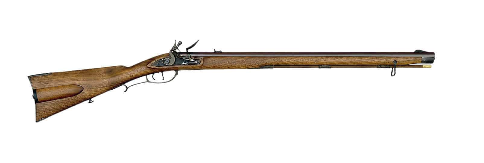 Pedersoli Jäger Hunter flintlock rifle. The Jäger rifle is well known in Germany and in the neighbouring Countries especially for hunting, it was taken to the New Continent by immigrants looking for a new life in a new Country. The Jäger rifle was one the most balanced and compact rifles, very characteristic for its big caliber; equipped with double set trigger, it was very precise, able to shoot big balls having a very high energy. The Jäger rifle was first made in the flintlock version and only afterwards it was transformed to a percussion rifle. Our reproduction gives the shooter improved results due to the broached rifling as well as the lock parts produced on highly advanced computer controlled machines (CNC). The fine artistic beauty is captured in the patch box with sliding lid, in the American walnut wood and completed with steel furniture and fittings which create a strong image for this rifle.
